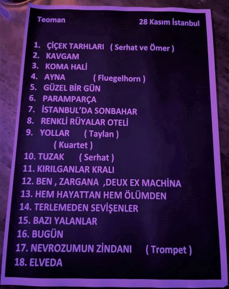 28 Kasım 2025. Zorlu PSM. Teoman konseri. Koyu antoloji. Çıkışında “Paramız boşa gitti”, “Bu ne biçim Teoman konseri” gibi yorumlar duymuş olsak da Koyu Antoloji konseri olduğunu bilerek bilet almış olanlar için oldukça zevkli bir konserdi. Teoman ekim ayının başında çıkan “Kırılganlar Kralı” albümünden iki şarkıyı ilk defa seslendirdiği konsere yine “Yanlışlıkla gelen var mı?” diye sorarak başladı. Sahnede ilk defa canlı dinlediğimiz “Çiçek Tarhları” şarkısını söyledikten sonra sorduğu soruya cevap olarak 10-15 kişinin eli havaya kalktı.