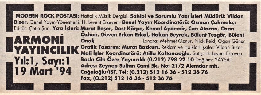 Burak Eldem, Orhan Kahyaoğlu, Halil Turhanlı, Sina Koloğlu, Ragıp Duran, Yavuz Baydar, Barbaros Devecioğlu, Mehmet Öznur, Merih Akoğul, Murat Ertel, Erkan Şimşek, Kubilay Tuncer ve Cem Berksoy. Çizimleriyle Nuri Kurtcebe ve Aptülika. Grafik dizaynı da Aqua’nın gitarcısı Cem Berksoy yaptı. Ayrıca Gaye Boralıoğlu’nun Ayşe Tütüncü ile röportajı da çok güzel olmuştu. Ekibe bakar mısınız, bugün bile hayal etmek zor!