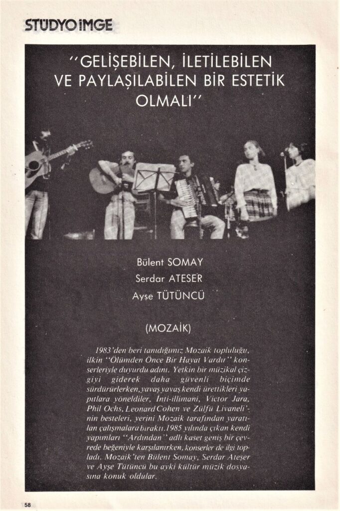 Şaşkın, yolunu bulmaya çalışan, çok amatör ve fakat heyecanlı Stüdyoİmge. Çok acayip bir ekip. Burak Eldem, Orhan Kahyaoğlu, Erdal Göksoy, Adnan Özer, Jak Deleon, İzzet Eti, Halil Turhanlı, Mario Levi, Tanıl Bora, Gökalp Baykal, Taner Ay ve başka bir sürü genç insan. Bugün bile inanamıyorum. Ayrıca İlhan İrem ve Zülfü Livaneli de yazı yazdı.