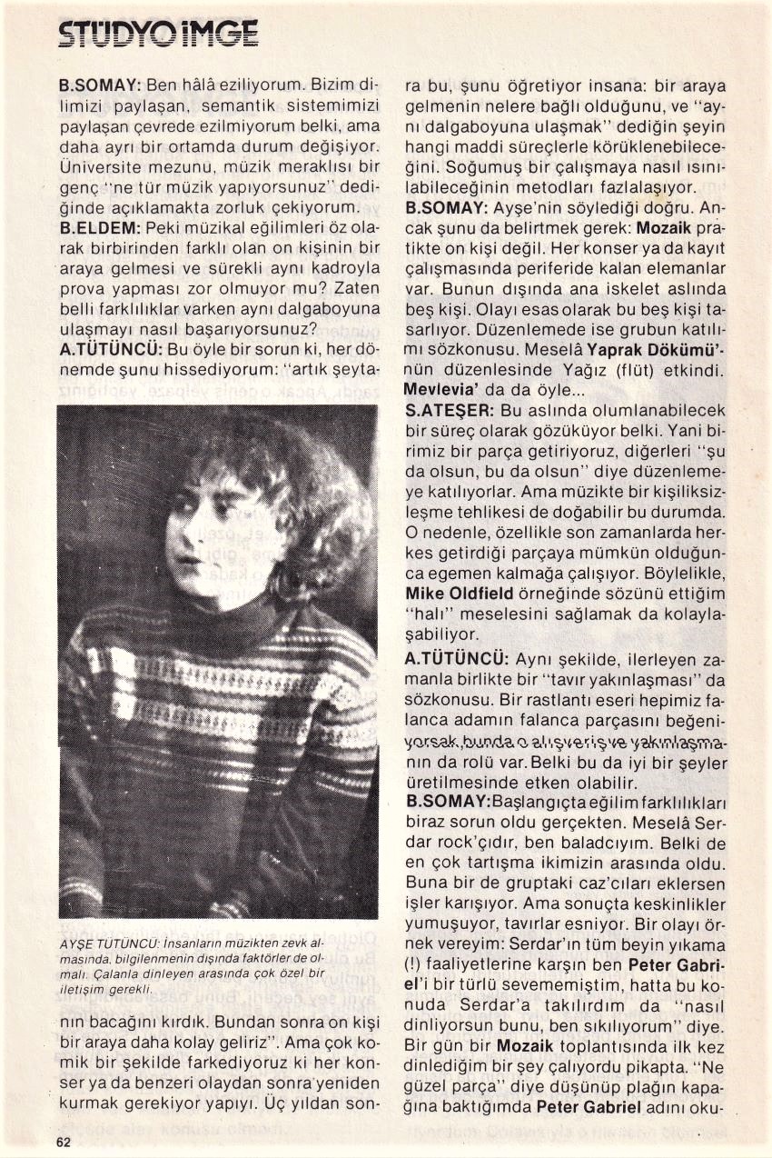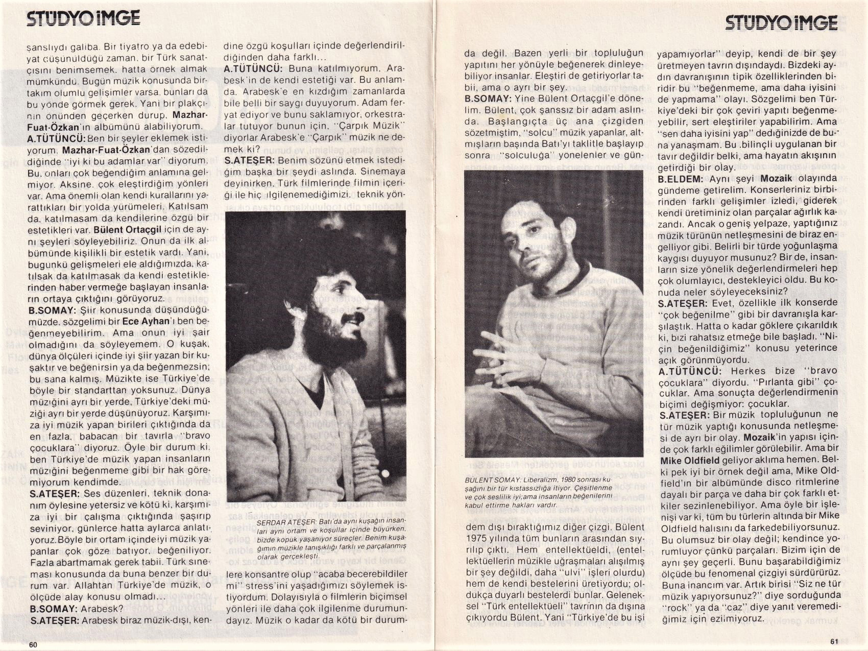 Şaşkın, yolunu bulmaya çalışan, çok amatör ve fakat heyecanlı Stüdyoİmge. Çok acayip bir ekip. Burak Eldem, Orhan Kahyaoğlu, Erdal Göksoy, Adnan Özer, Jak Deleon, İzzet Eti, Halil Turhanlı, Mario Levi, Tanıl Bora, Gökalp Baykal, Taner Ay ve başka bir sürü genç insan. Bugün bile inanamıyorum. Ayrıca İlhan İrem ve Zülfü Livaneli de yazı yazdı.
