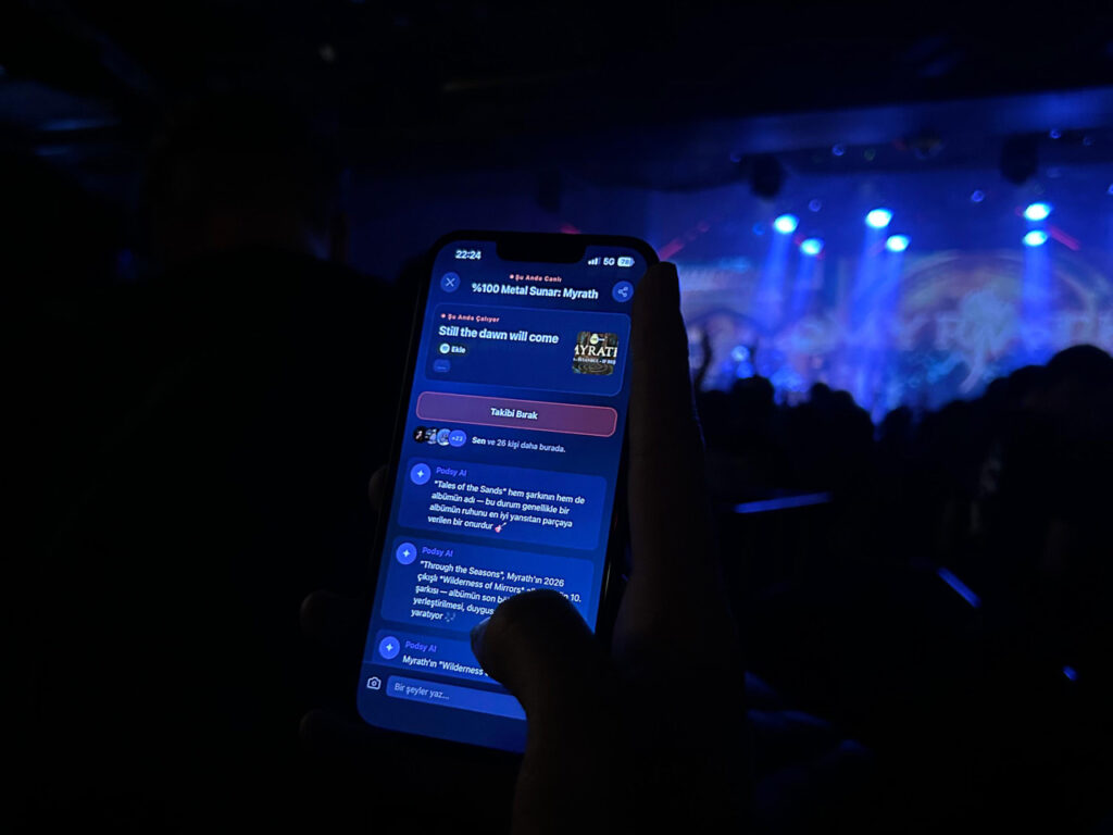 PodsyLive ekibinin şu sıralar gurur duyduğu özellik, yeni problem tanımları ve onlara getirilen çözümleri içeriyor. Daha önce uygulama kendini konser öncesi ve sonrasına yönelik anların problemlerine bir çözüm olarak konumlandırırken, artık tam olarak konser anındaki problemlere de yönelik çözümler sunmasıyla, bir konserin tüm aşamalarına hakim bir konuma geçmiş durumda. Lafı daha fazla uzatmadan anlatayım: PodsyLive geçen hafta, iOS ve Android taraflarında son yılların kullanımı giderek artan “canlı etkinlikler” özelliğini temel alan ve bunu kullanarak telefonun işletim sistemine entegre olan bir özelliğe kavuştu. Buna göre artık o an olmakta olan konserler, uygulamanın ana sayfasında yukarıda Instagram storyleri gibi yatay olarak diziliyor, birine tıklayınca kullanıcı ilgili konserin canlı sayfasına yönleniyor, buradan eğer konseri takip etme butonuna basarsa bundan sonra konser adeta telefonunun kilit ekranına yapışıp kalıyor. Artık kullanıcı konserin durumunu takip edebilir: kapı açılış, konserin başlama saati, mekanın yeme içme kampanyaları ve en önemlisi konser başladığı zaman o esnada sahnedeki grubun çaldığı şarkının ismi ile sıradaki şarkı hakkında ipucu… Uygulamaya geri dönüldüğünde ise bu bilgilerin yanı sıra uygulama içerisinde yapay zekâ kullanımının ilk adımlarını sergileyen Podsy AI devreye giriyor, çalmakta olan şarkı hakkında kısa bilgiler veriyor. Böylece konseri izleyen biri bilmediği bir şarkı çaldığı zaman buradan olan bitene hâkim olabilirken, konsere gidemeyen biri de konseri uzaktan canlı blog tadında takip edebiliyor, Spotify üzerinden ilgili şarkının sayfasına ışınlanabiliyor. Elbette orada yazma yetkisi sadece Podsy AI’ye ait değil, konser hakkında PodsyLive üyeleri de yazı veya fotoğraf paylaşabiliyor.