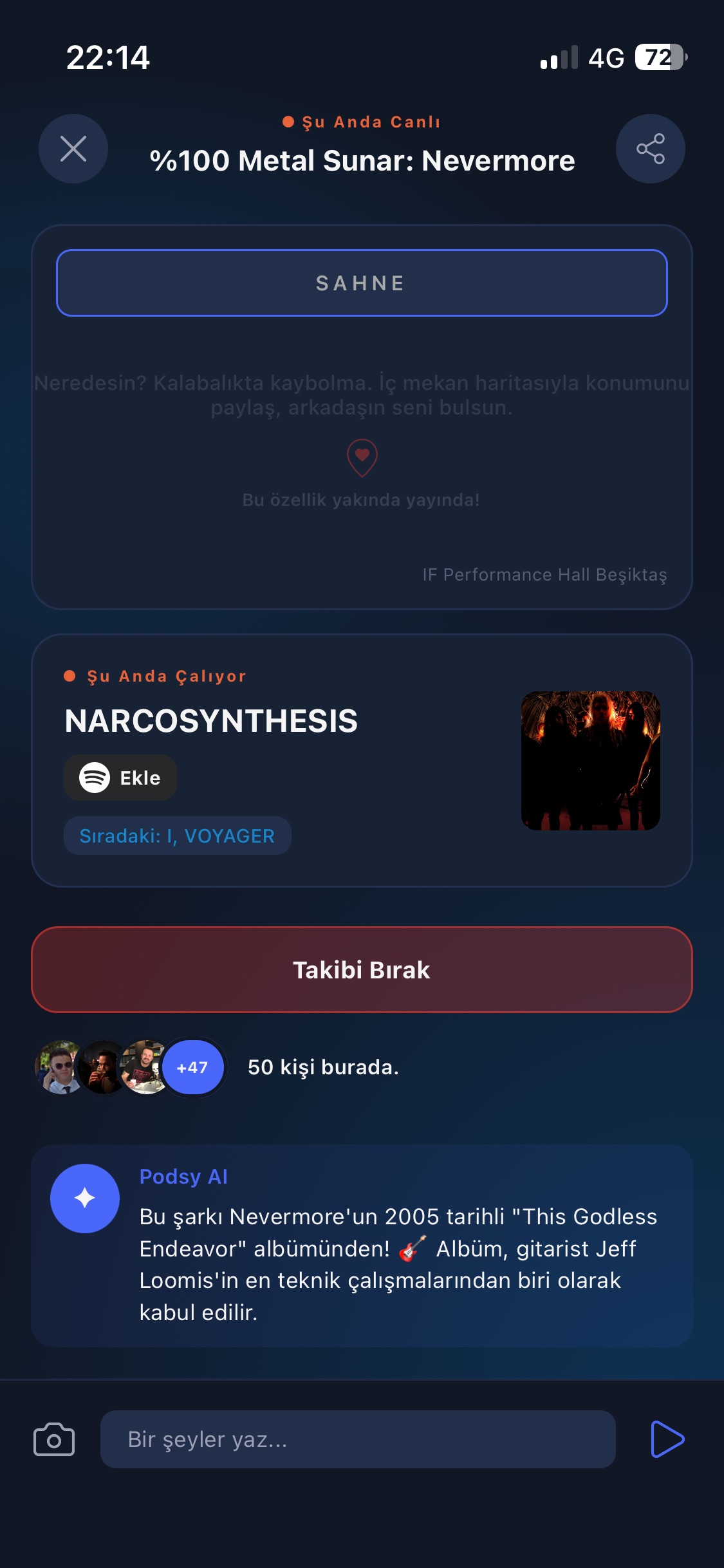 PodsyLive ekibinin şu sıralar gurur duyduğu özellik, yeni problem tanımları ve onlara getirilen çözümleri içeriyor. Daha önce uygulama kendini konser öncesi ve sonrasına yönelik anların problemlerine bir çözüm olarak konumlandırırken, artık tam olarak konser anındaki problemlere de yönelik çözümler sunmasıyla, bir konserin tüm aşamalarına hakim bir konuma geçmiş durumda. Lafı daha fazla uzatmadan anlatayım: PodsyLive geçen hafta, iOS ve Android taraflarında son yılların kullanımı giderek artan “canlı etkinlikler” özelliğini temel alan ve bunu kullanarak telefonun işletim sistemine entegre olan bir özelliğe kavuştu. Buna göre artık o an olmakta olan konserler, uygulamanın ana sayfasında yukarıda Instagram storyleri gibi yatay olarak diziliyor, birine tıklayınca kullanıcı ilgili konserin canlı sayfasına yönleniyor, buradan eğer konseri takip etme butonuna basarsa bundan sonra konser adeta telefonunun kilit ekranına yapışıp kalıyor. Artık kullanıcı konserin durumunu takip edebilir: kapı açılış, konserin başlama saati, mekanın yeme içme kampanyaları ve en önemlisi konser başladığı zaman o esnada sahnedeki grubun çaldığı şarkının ismi ile sıradaki şarkı hakkında ipucu… Uygulamaya geri dönüldüğünde ise bu bilgilerin yanı sıra uygulama içerisinde yapay zekâ kullanımının ilk adımlarını sergileyen Podsy AI devreye giriyor, çalmakta olan şarkı hakkında kısa bilgiler veriyor. Böylece konseri izleyen biri bilmediği bir şarkı çaldığı zaman buradan olan bitene hâkim olabilirken, konsere gidemeyen biri de konseri uzaktan canlı blog tadında takip edebiliyor, Spotify üzerinden ilgili şarkının sayfasına ışınlanabiliyor. Elbette orada yazma yetkisi sadece Podsy AI’ye ait değil, konser hakkında PodsyLive üyeleri de yazı veya fotoğraf paylaşabiliyor.