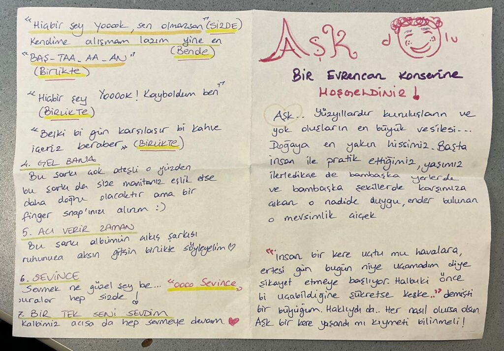 Yazıya başlamadan önce konseri tanımlamak için aklımda bir cümle vardı: Sanki bir karaoke barda arkadaşınız sahneye çıkmış da ona eşlik ediyormuşsunuz gibi. Bence bu cümle hem konseri hem de Evrencan’ın ekibiyle ve seyirciyle olan ilişkisini çok güzel özetliyor. Konser boyunca Evrencan’ın 18 yaşından askerdeki haline, âşık hallerinden terk edilmiş ve hüzünlü hallerine kadar her halini o dönem yazdığı şarkılar üzerinden ayrı birer sanatçı gibi deneyimledik. Konseri anlatmaya girişte dağıtılan kitapçıklardan bahsetmeden başlayamam ama.