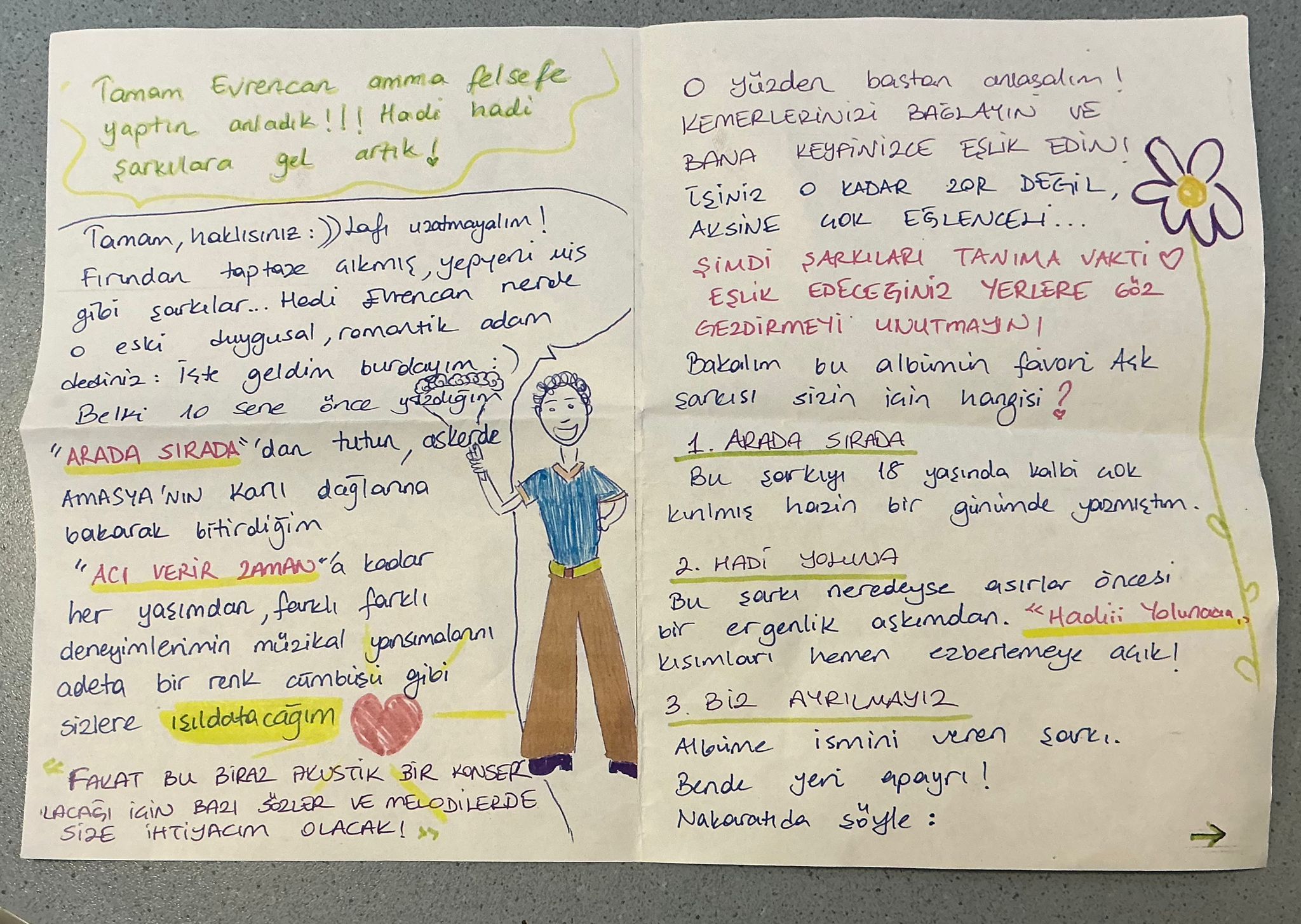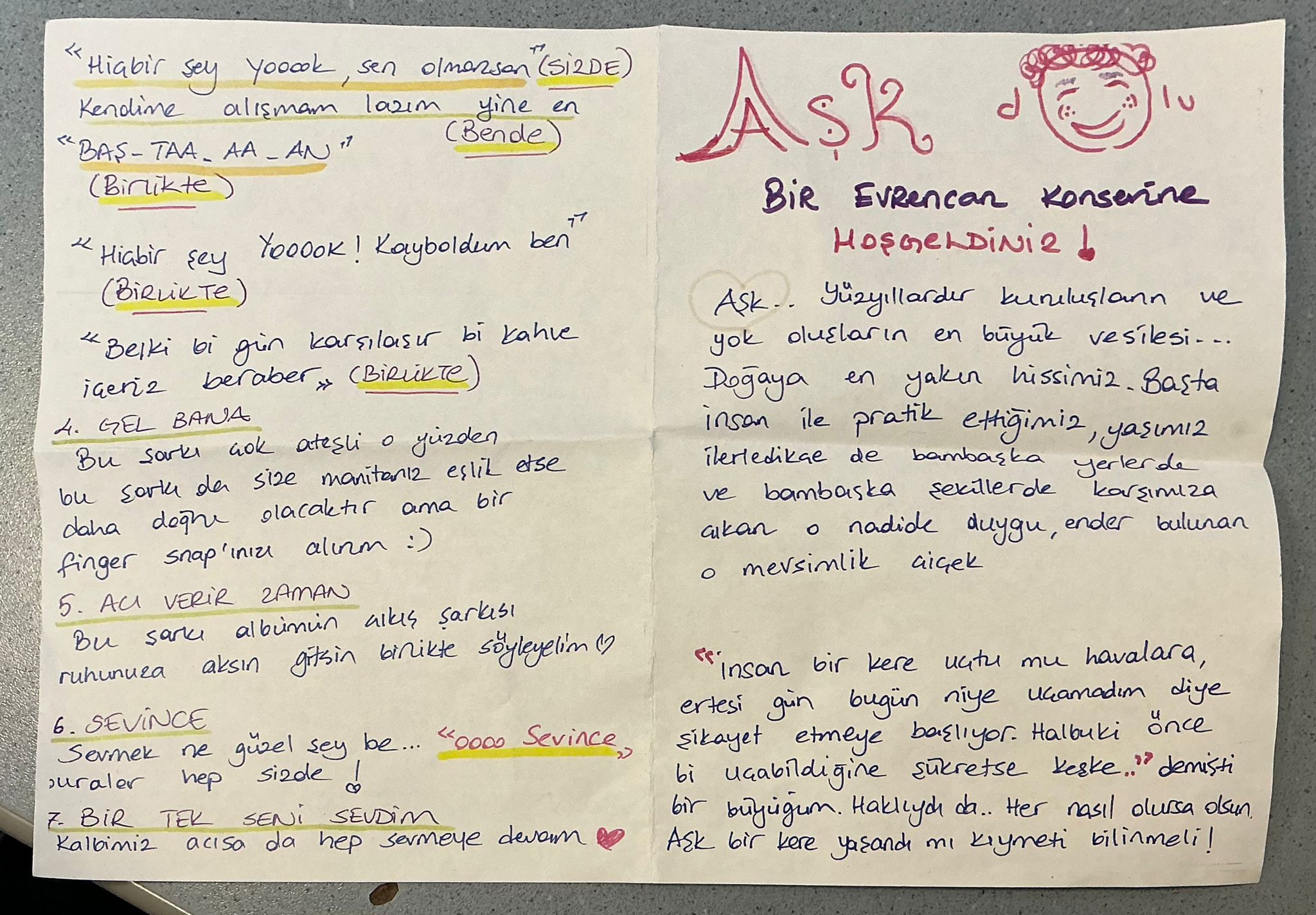 Kitapçığın ilk sayfası aşk üzerine. İkinci sayfasında biraz konserden bahsediyor Evrencan. Son iki sayfasında da yeni çıkacak albümden çalınacak şarkıların sırası ve seyircinin eşlik edeceği yerlerle ilgili direktifler var.
